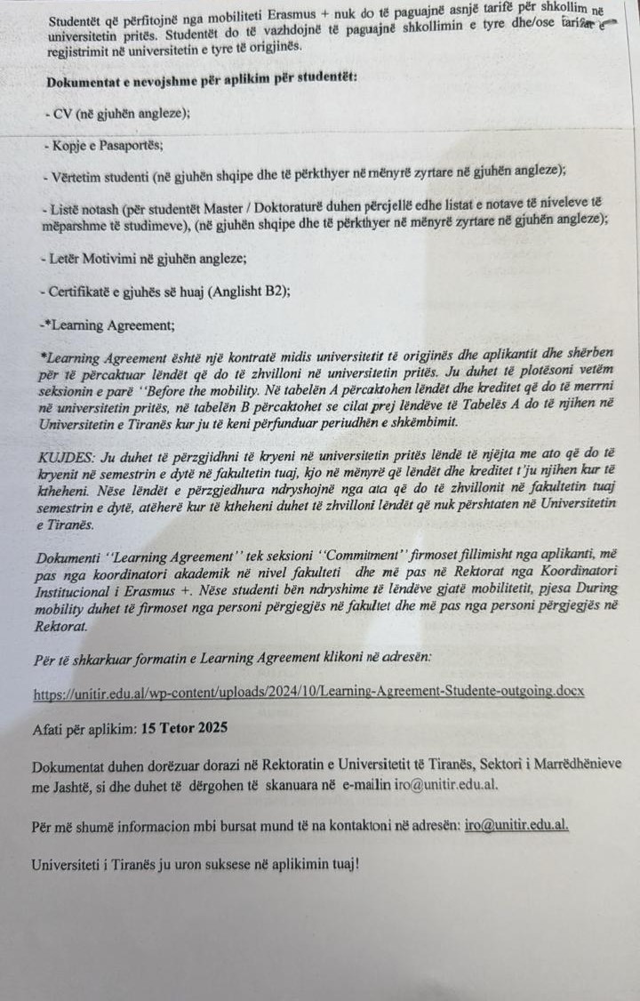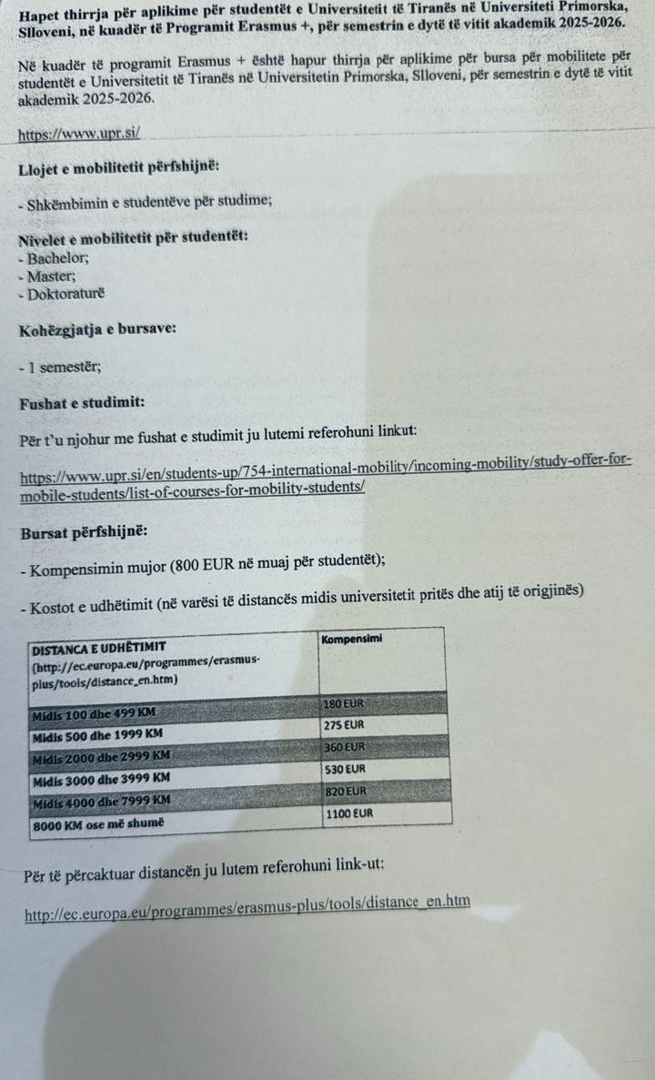 Hapet thirrja per aplikime per studentet e Universitetit te Tiranes ne Universitetin Primorska Slloveni,ne kusder ter programit Erasmus+.