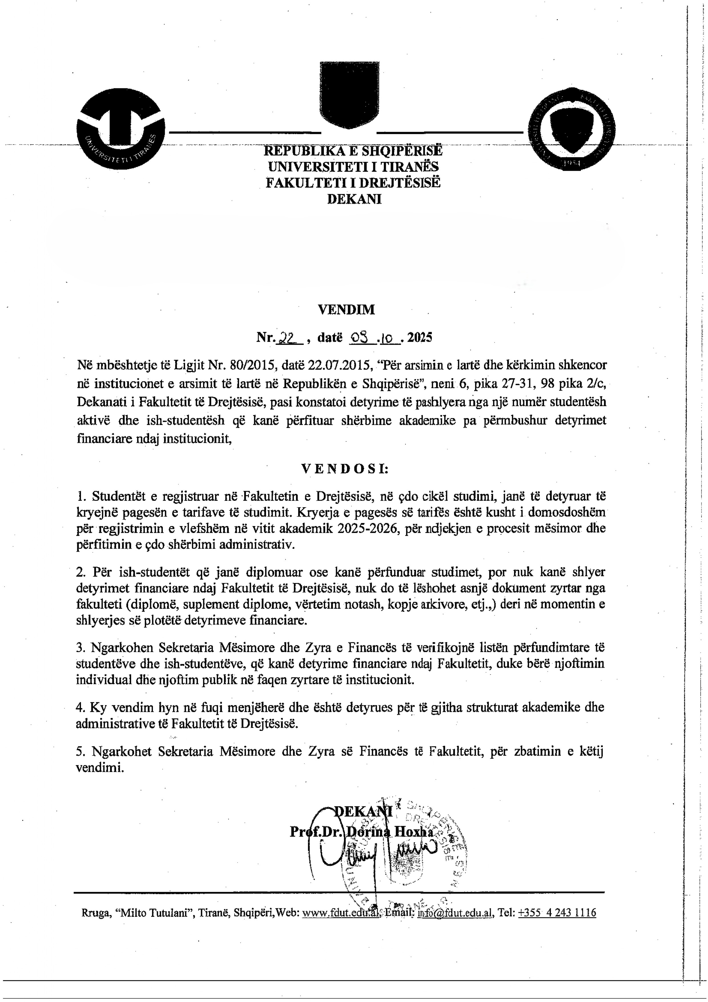 Njoftim per studentet qe kane detyrime financiare te pashlyera ndaj Fakultetit te Drejtesise.