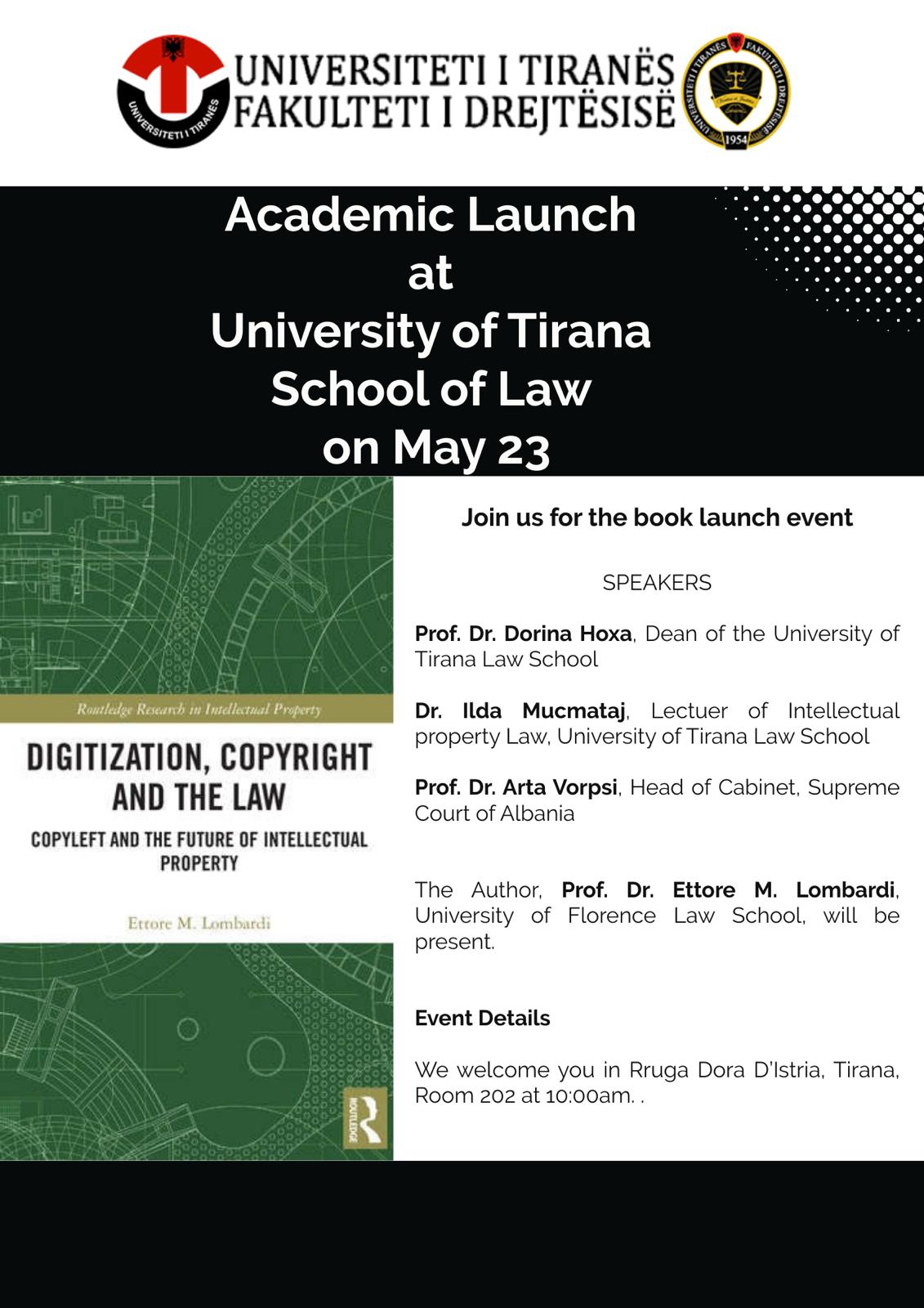 Fakulteti i Drejtësisë, Universiteti i Tiranës, ka kënaqësinë të njoftojë organzimin e një eventi të veçantë akademik: Prezantim i librit “Dixhitalizimi, të drejtat e autorit dhe ligji” të autorit Ettore M.Lombardi, Universiteti i Florence.