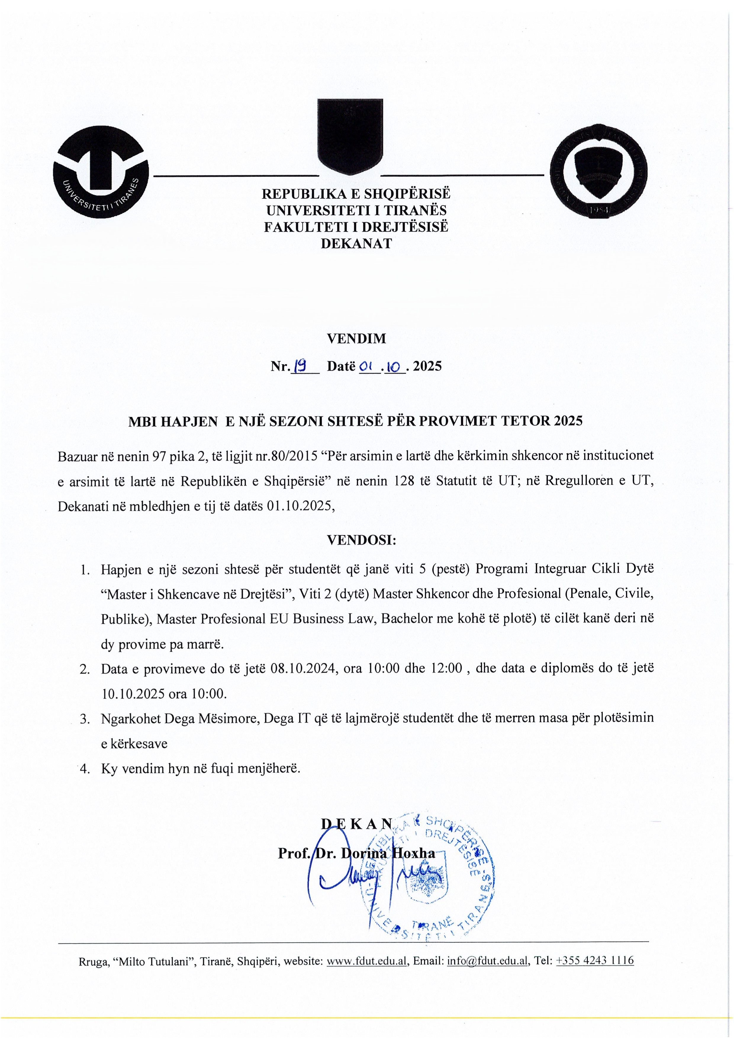 Vendim Mbi Hapjen E Sezonit Shtesë Për Provimet Tetor 2025.