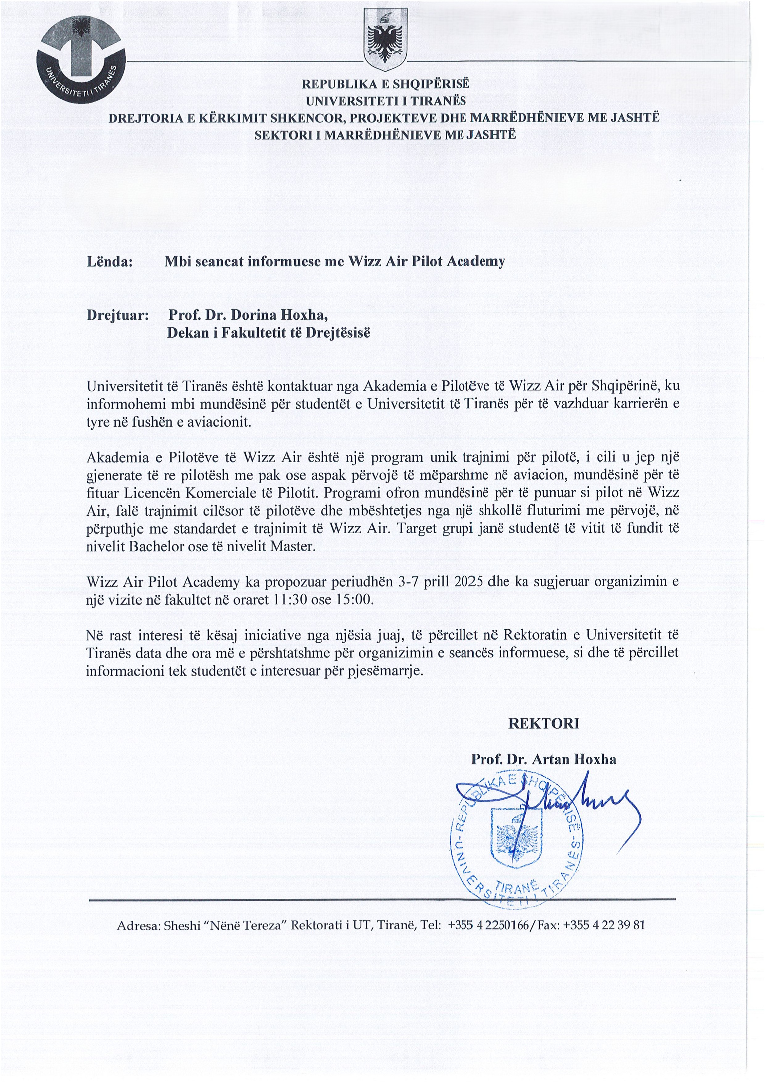 Wizz Air Pilot Academy zhvillon nje takim informues me studentet e Fakultetit te Drejtesise,mbi mundesine per tu trajnuar dhe punuar si pilot prane wizz air.
